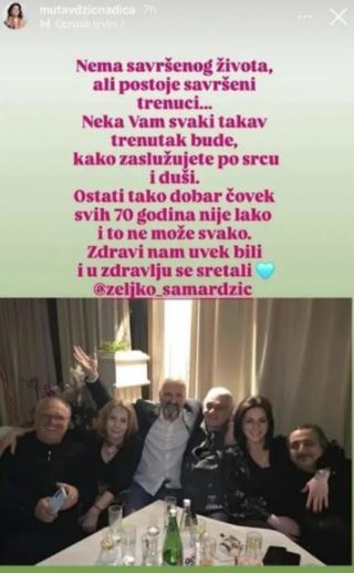 -Nema savršenog života, ali postoje savršeni trenuci… Neka vam svaki takav trenutak bude, kako zaslužujete posrću. Ostati tako dobar čovjek svih 70 godina nije lako i to ne može svako. Zdravima uvijek bili i u zdravlju se sretali – poručila je Nadica Mutavdžić i označila Željka Samardžića.
