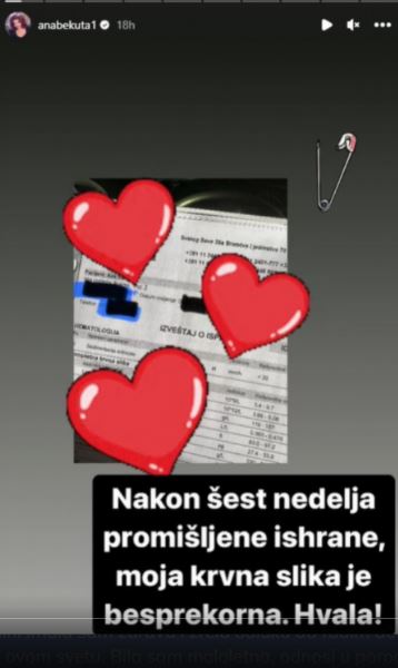 Nakon što je pokazala nalaze krvi Bekuta je otkrila da je, zahvaljujući izbalansiranoj ishrani, sve u najboljem redu.
